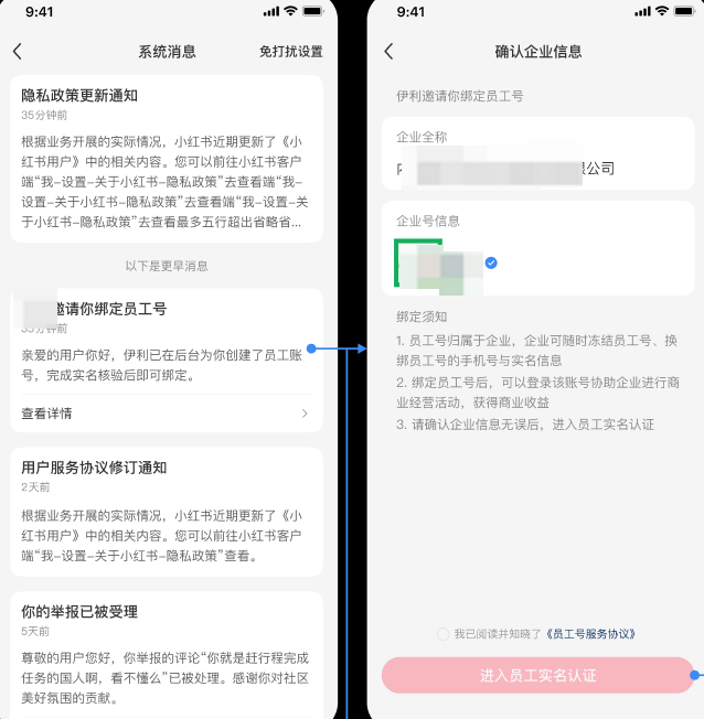 1. 企业完成企业员工号创建审核后,员工号将在“系统消息”收到验证私信链接。