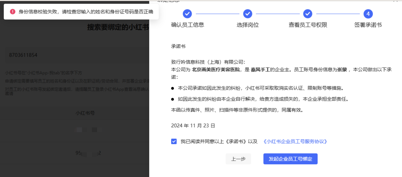 信息是否一致:客户自查要绑定的小红书账号实名信息与专业号后台填写的员工姓名和身份证号是否一致